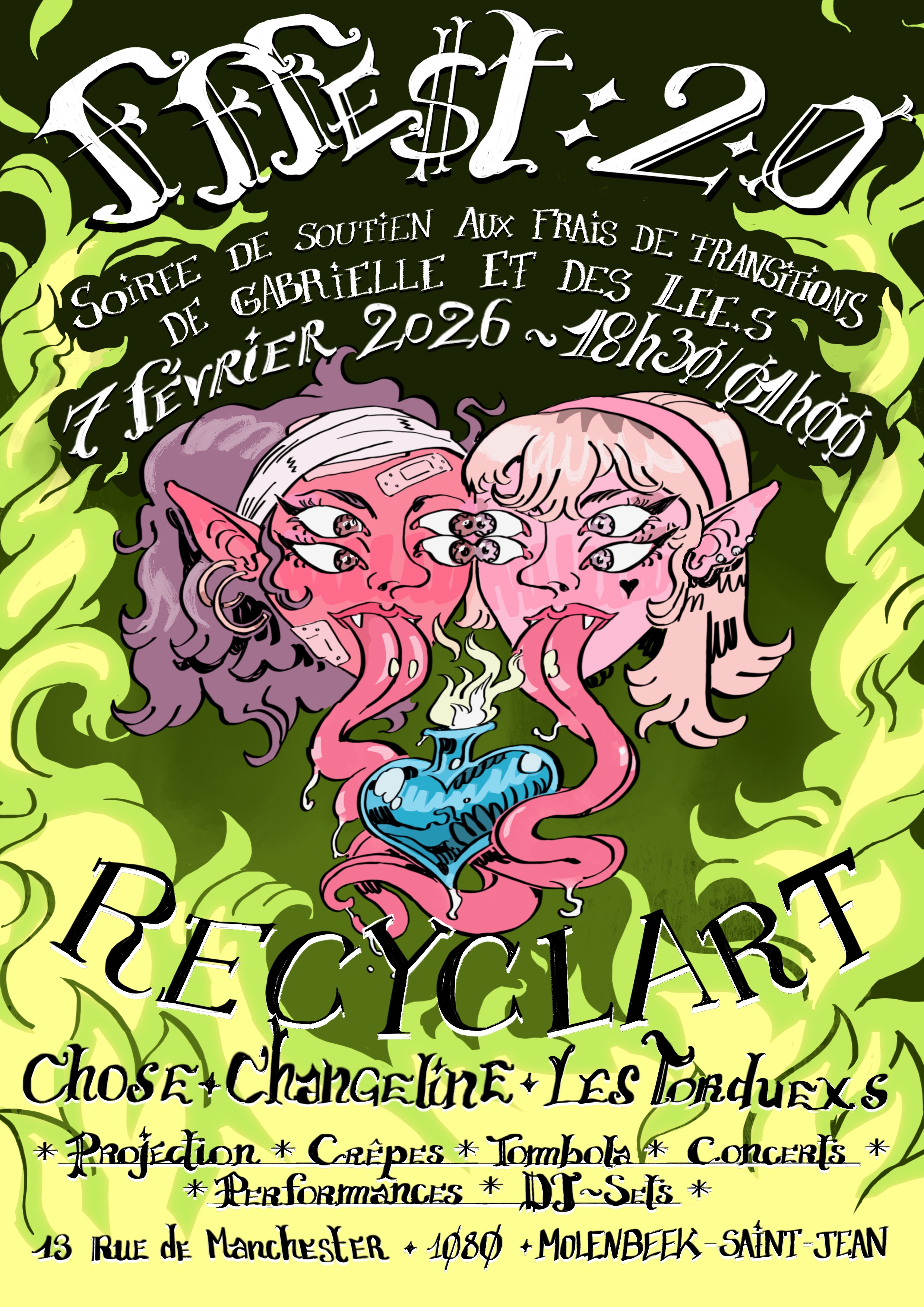 -> Het geld van de inkom, de tombola, de pannenkoeken en de zeefdrukken gaat naar de financiering van de genderbevestigende operaties van Gabrielle en Lee’s.